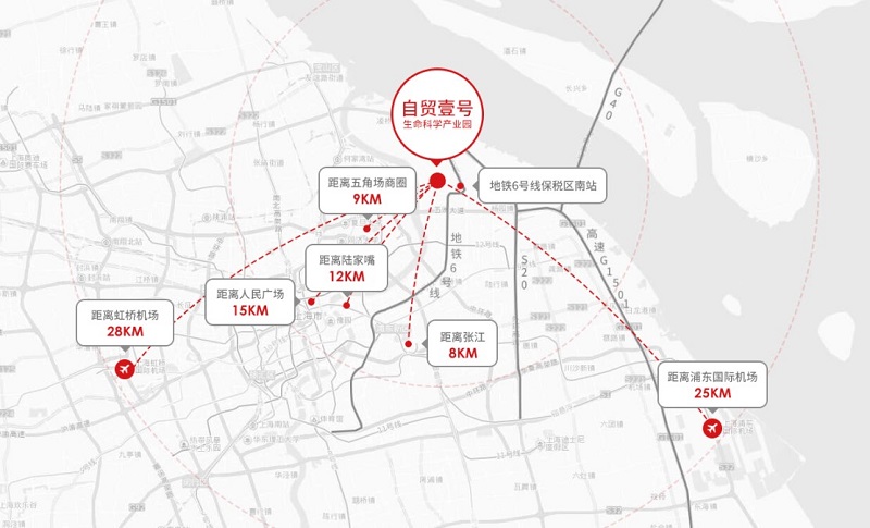 区域位置 上海自贸壹号生命科技产业园毗邻金桥工业园区、张江高科技园区、五角场经济圈/杨浦科教区(复旦大学、同济大学、第二军医大学、上海理工大学、上海电力大学、上海海洋大学等高校本部)、陆家嘴金融区,周边产业联动性良好。 园区周边亦具备便利的公共交通,地铁6号线外高桥保税区南站直达,项目周边有保税区公交3路,5路和6路。另外,地铁12号线巨峰路站距离园区5公里。规划中的轨道交通10号线延伸段也即将于2018年底通车,另外园区还设短驳车可到达轨道交通站点。 园区北部即为五洲大道,可直达高速G1501、S20、G40,通过G1501可到达上海所有区域。